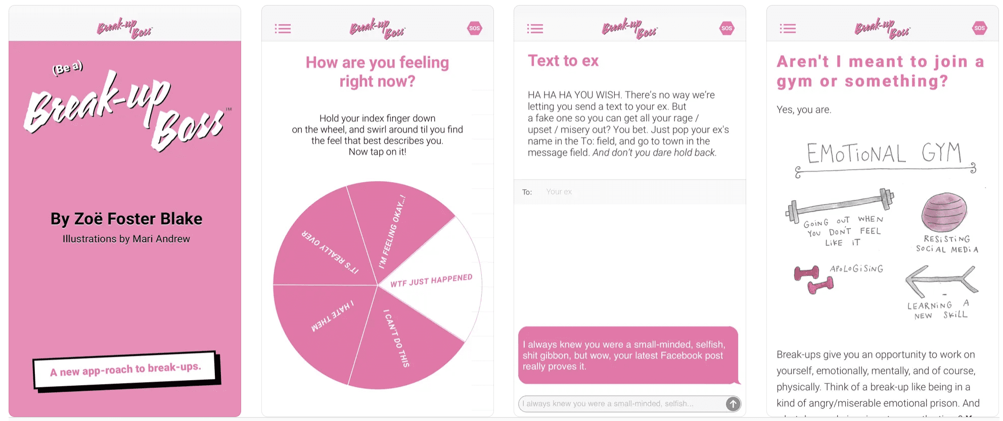Break-up Boss, the brainchild of relationship writer Zoë Foster Blake, steps in as a shoulder to lean on for those ending relationships. Think of it as a self-help book, packed with practical advice, affirmations, and even therapeutic games like sending a fake message to your ex.