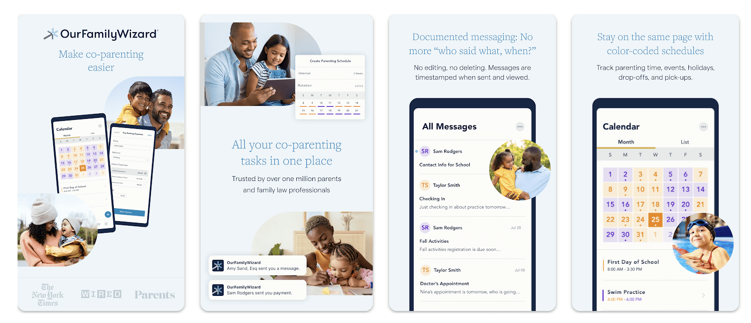 Designed to help parents communicate and share centralized child-centered information, OurFamilyWizard serves as a platform for co-parents to navigate the intricacies of joint custody. Parents can upload and manage the child’s activities, calendar, and co-parenting schedules, track expenses, share medical and school files, and send secure messages directly through the platform, eliminating the need for face-to-face communication.