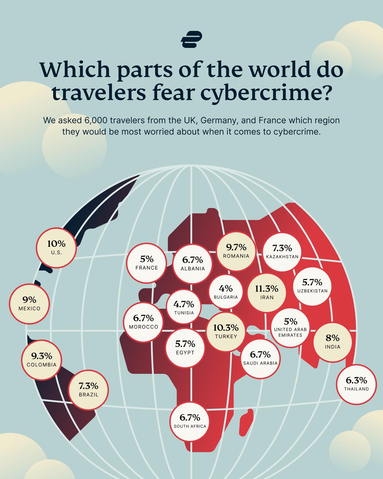 We asked European travelers from the UK, Germany, and France which region they would be most worried about when it comes to cybercrime when visiting on holiday. Among the top regions that invoked concern, the U.S. stood out alongside other popular holiday destinations like Türkiye, Mexico, and Brazil. (Survey respondents were asked to choose from a UN list of the top 50 most popular countries for international travel in 2022.)