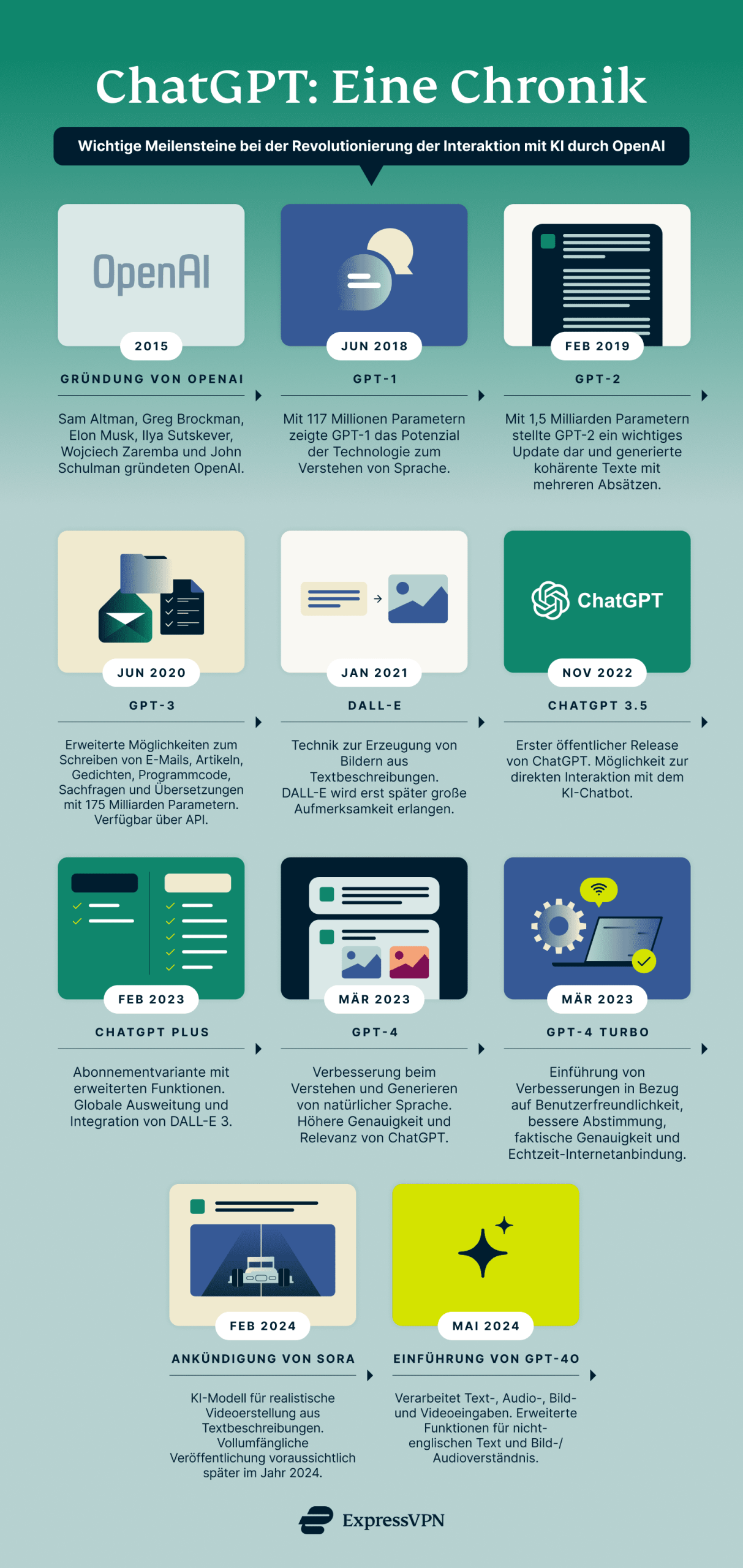 Im Laufe der Jahre gipfelte die bahnbrechende Arbeit von OpenAI in der Entwicklung von ChatGPT und hat die Art und Weise, wie die Gesellschaft mit künstlicher Intelligenz interagiert, verändert. Dies sind die wichtigsten Meilensteine, die die Entwicklung von ChatGPT geprägt haben: