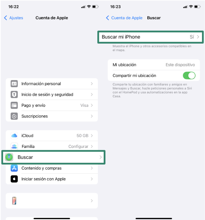 2. Asegúrate de que Buscar mi iPhone, Buscar mi red y Enviar última ubicación están activos.