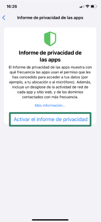 Tras activarlo, el Informe de privacidad de las apps muestra qué aplicaciones acceden a datos como la ubicación, la cámara o el micrófono y con qué páginas web suelen contactar.