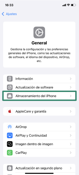 1. Ir a Ajustes y entrar en General > Almacenamiento del iPhone.