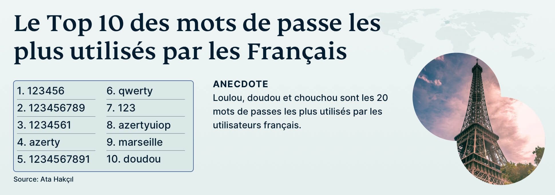 Ceux qui sont faciles à saisir, comme 123456, sont les plus communs. Certaines différences entre les mauvais mots de passe sont simplement dues à la langue. Par exemple : password est très apprécié des anglophones, alors que les germanophones utilisent passwort. Notons également la disposition du clavier français qui est différente de celle du clavier anglais (qwerty est remplacé par azerty).