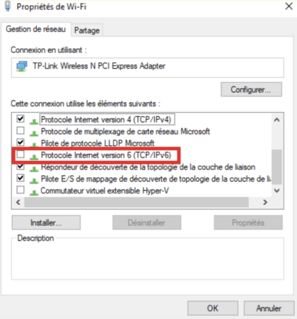 - Décochez la case Protocole Internet version 6 (TCP/IPv6), puis cliquez sur OK pour confirmer.