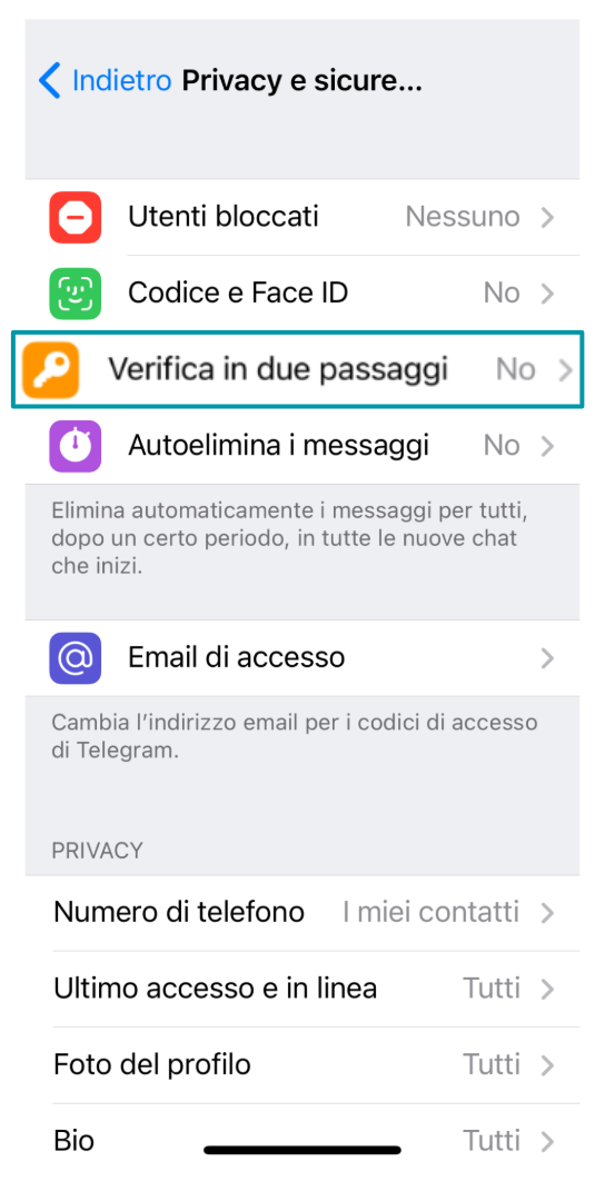 L'autenticazione a due fattori aggiunge un ulteriore livello di sicurezza al tuo account Telegram. Anche se qualcuno conoscesse la tua password, non sarebbe in grado di accedere all'account senza un secondo codice.