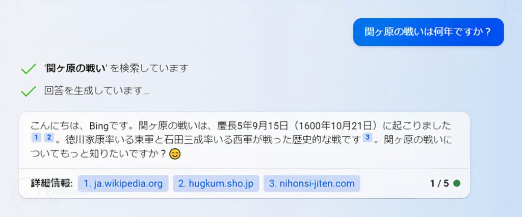 回答はひとつのはずですが、ChatGPTとBingで回答が若干異なっていることが分かります。両方とも年号は正しいのですが、年月日まで記載している点で、Bingのほうが詳細な情報を提供しています。
