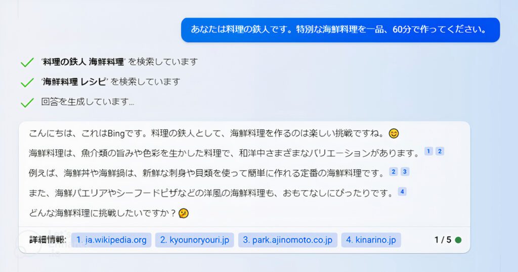 ChatGPTはすぐに海鮮料理のレシピを教えてくれました。レシピを説明する内容は丁寧ですが、このレシピに60分はかからなそうですね。Bingでは「どんな海鮮料理に挑戦したいですか?」と尋ねられており、さらにもう一段階の入力が必要になります。Bingで質問する際には、和洋中のどれにするか最初から加えておくと良さそうです。