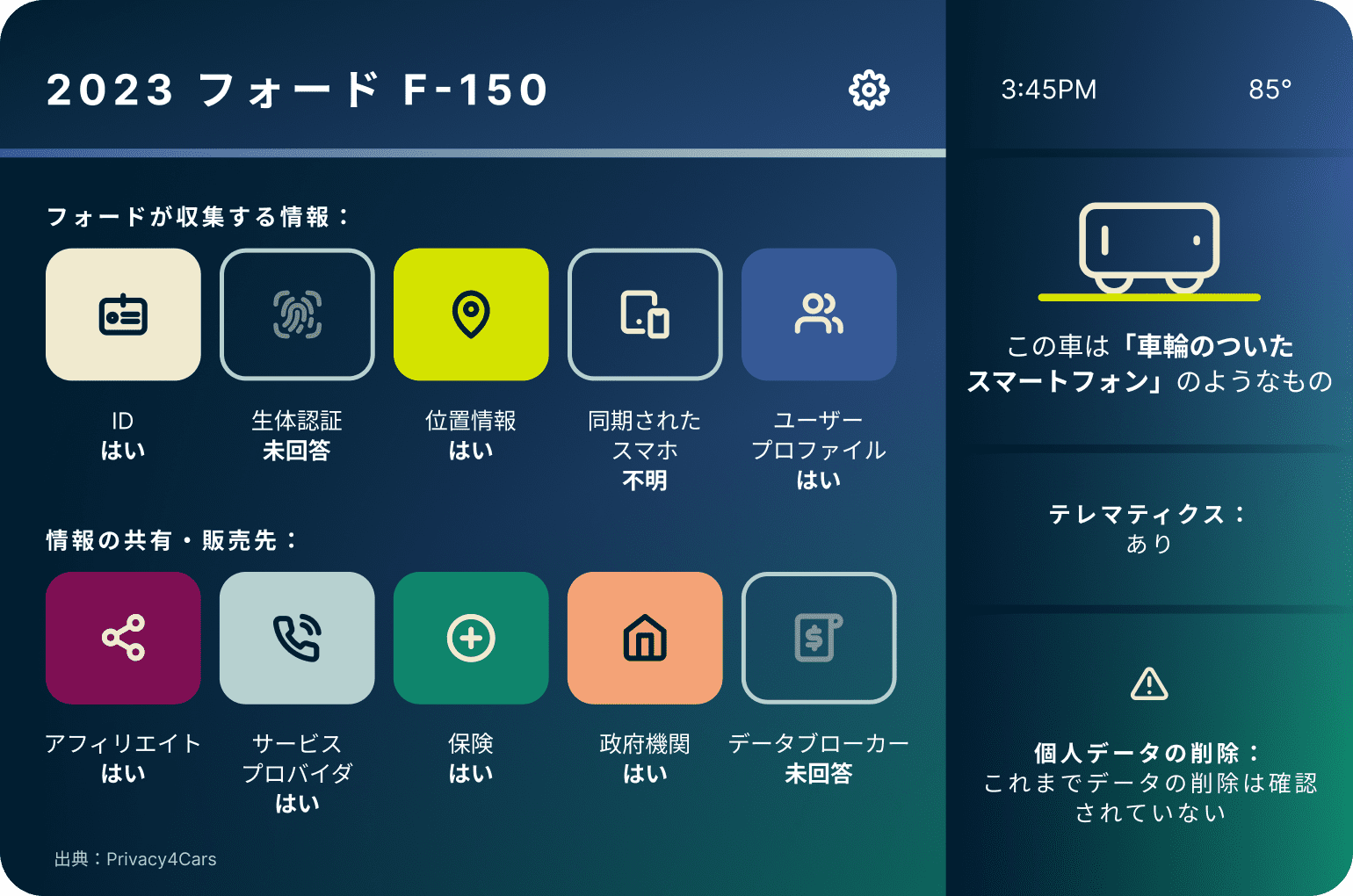 - 米国を拠点とする車両のプライバシー技術企業であるPrivacy4Carsは今年初め、自動車によるデータ収集の範囲をドライバーに通知するためのツール「Vehicle Privacy Report」を導入した