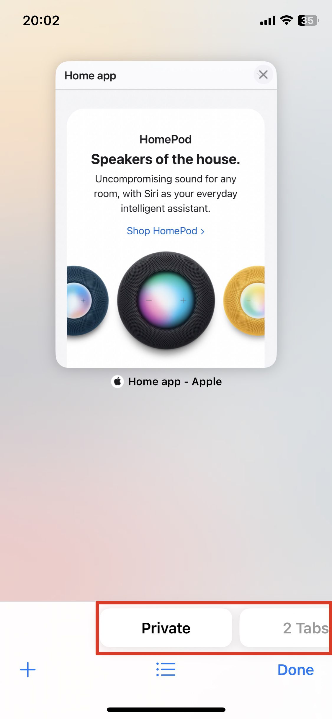 - これで、開いたタブの一覧が見えます。画面の下に、開いたタブ数を表示するボタンが表示されます。そのボタンを右にスワイプするか、グレーで表示されたプライベートボタンをタップします