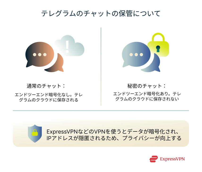 テレグラムはクラウド型のメッセージアプリなので、チャットはデバイス間で簡単に同期されます。しかし、裏を返せば、データはアプリのサーバーに保存され得るということになります。テレグラムがどのようなデータを収集し、どれくらいの期間保存するのか知っておけば、アプリ使用時にプライバシーがどの程度保護されるのか理解できます。