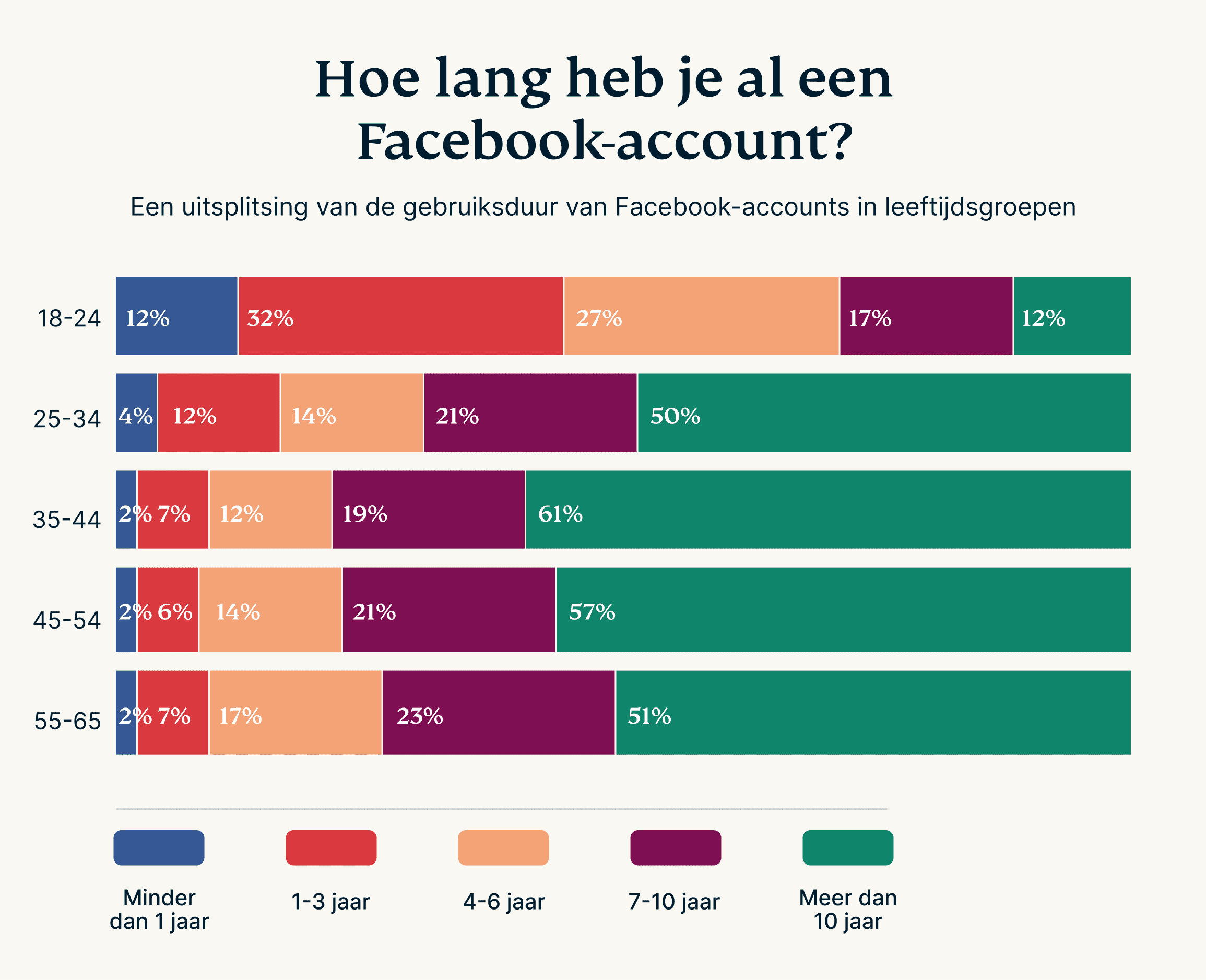 35-44-jarigen zijn het meest trouw aan Facebook: 72% gebruikt het platform actief en 61% zit er al meer dan tien jaar op.