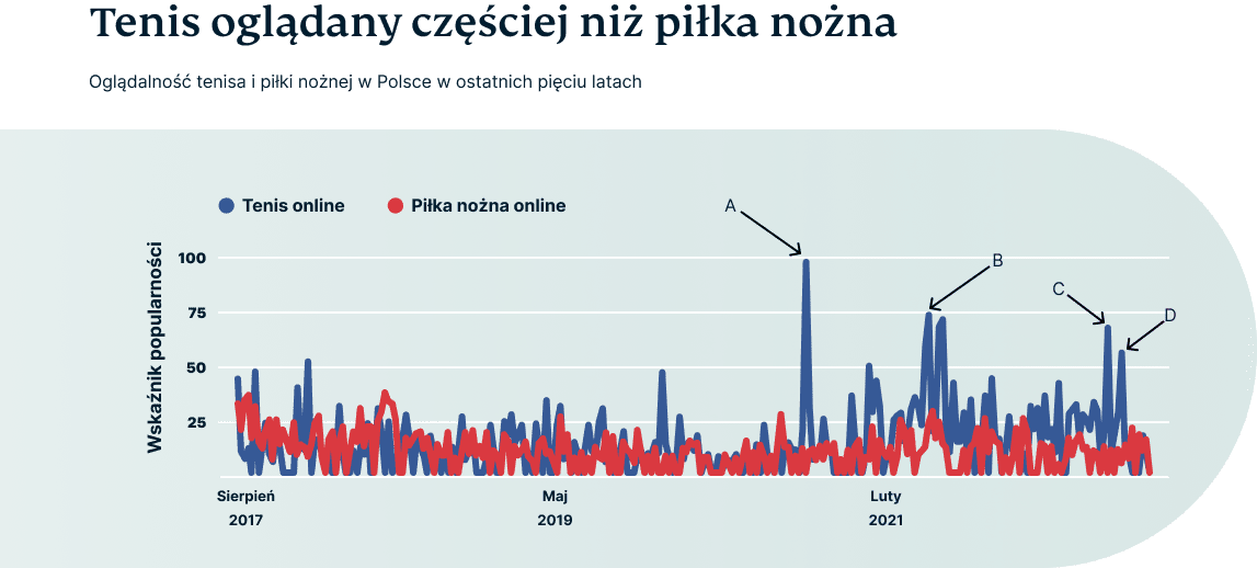 Analizując wyniki wyszukiwań Google Trends dotyczące transmisji sportowych, nie ma wątpliwości: tenis jest częściej oglądanym sportem w Polsce online niż piłka nożna. Futbol to oczywiście piękny sport, który zajmuje szczególne miejsce w naszych sercach. Jednakże sukcesy Polaków, zwłaszcza niedawne zwycięstwa Igi Świątek przyczyniają się do zwiększenia zainteresowania tenisem.