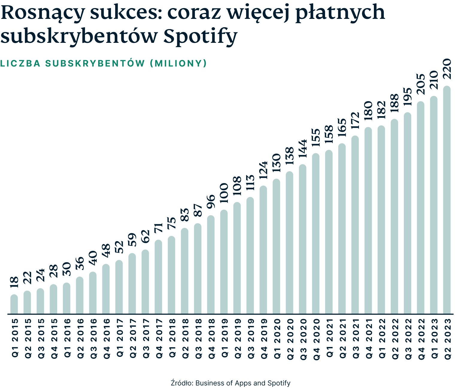 Według raportu branżowego International Music Summit, Spotify jest liderem na rynku streamingu muzyki. W 2022 r. baza subskrybentów Spotify stanowiła prawie 31% udziału w światowym segmencie – mówi się, że liczba ta wzrośnie jeszcze bardziej do końca 2023 r. Kolejne miejsca zajmują Apple Music z 13,7% udziałem i Tencent Music z 13,4% udziałem.