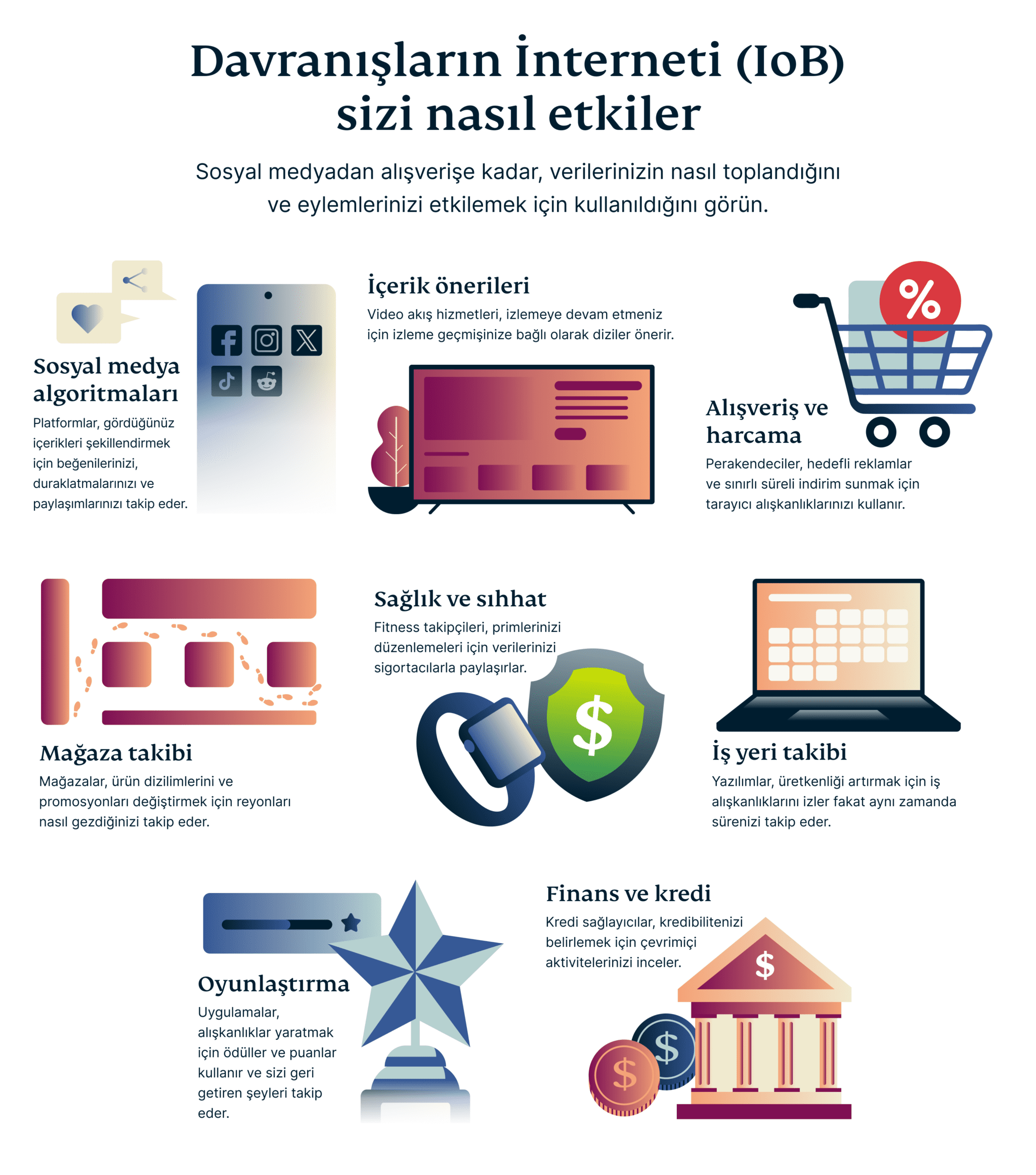 - Sosyal medya algoritmalarından yayın önerilerine, perakende takibinden finansal işlemlere kadar, IoB neredeyse her şeyi etkiler ve çoğu zaman faydalı olmanın ötesinde rahatsız edici bir hal alır.