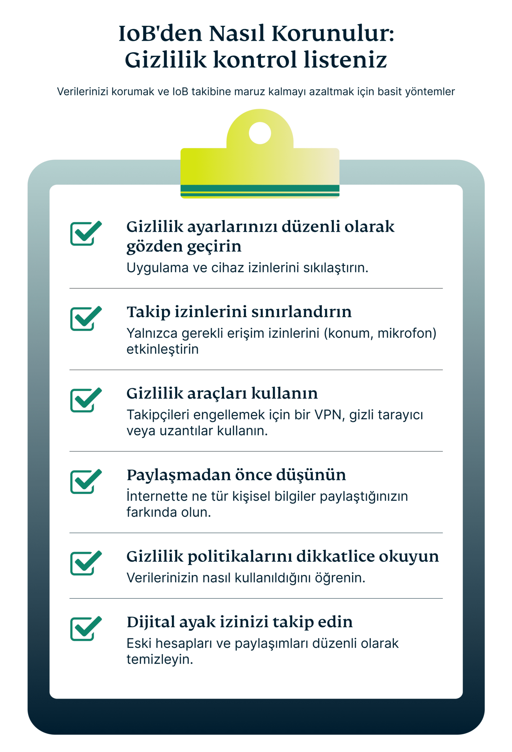 IoB, verilere dayanır—bu nedenle ne kadar az veri varsa o kadar iyidir. Sosyal medyada bir şey paylaşmadan veya bir hizmete kaydolmadan önce ne paylaştığınızı dikkatlice düşünün. Konumunuz, rutinleriniz veya hatta zararsız gibi görünen beğeni ve ilgi alanları gibi kişisel detaylar bile dijital profilinize katkıda bulunabilir. Ne ile etkileşime geçtiğiniz, kimi takip ettiğiniz ve hangi tür içeriklere tıkladığınız, ayrıntılı bir profilin parçası haline gelebilir.