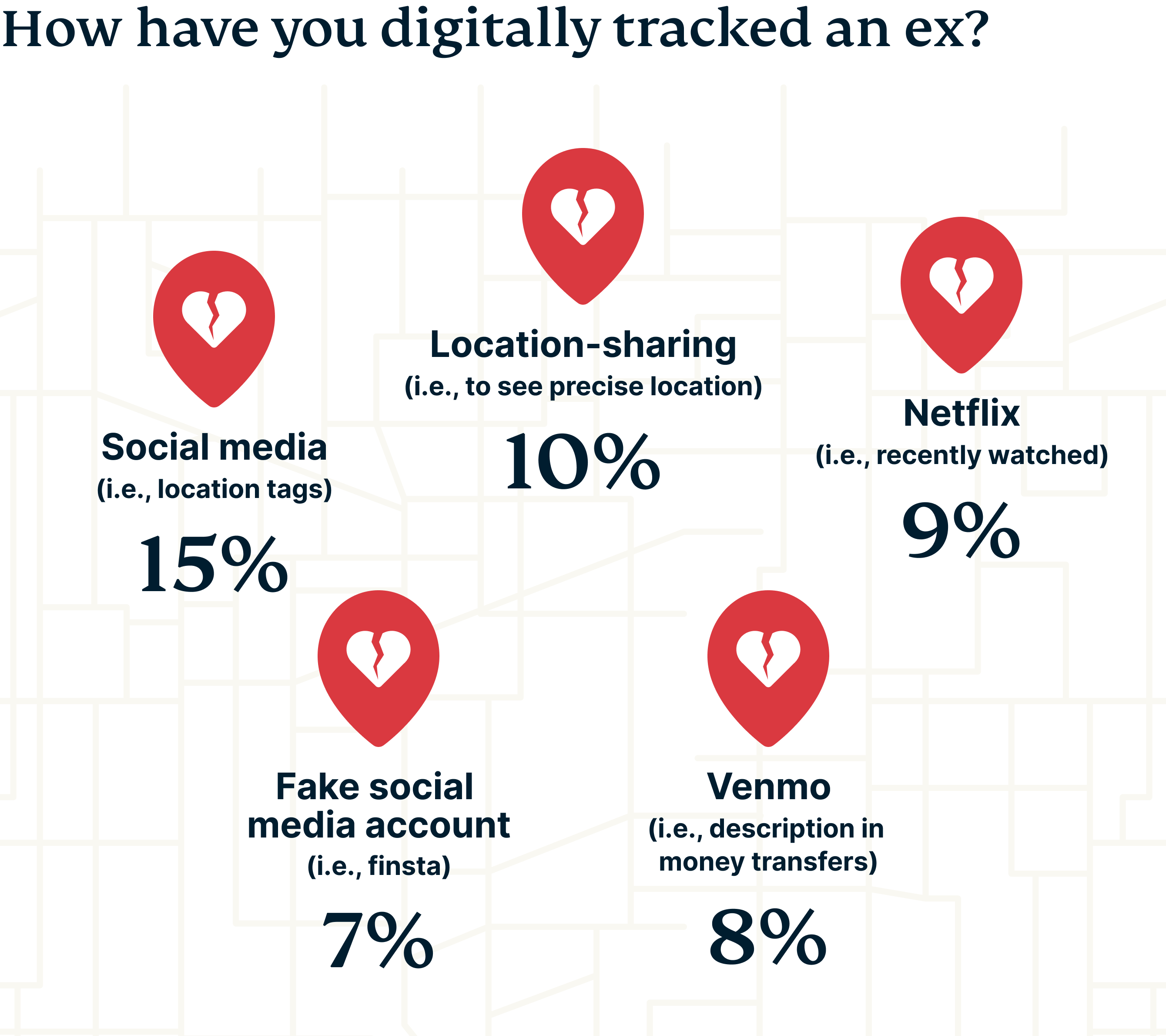 Perhaps most alarmingly, 30% of Americans admit to using tech to digitally track an ex. Social media location tags are the most common way, closely followed by location-sharing services and keeping tabs on an ex’s Netflix watch history.