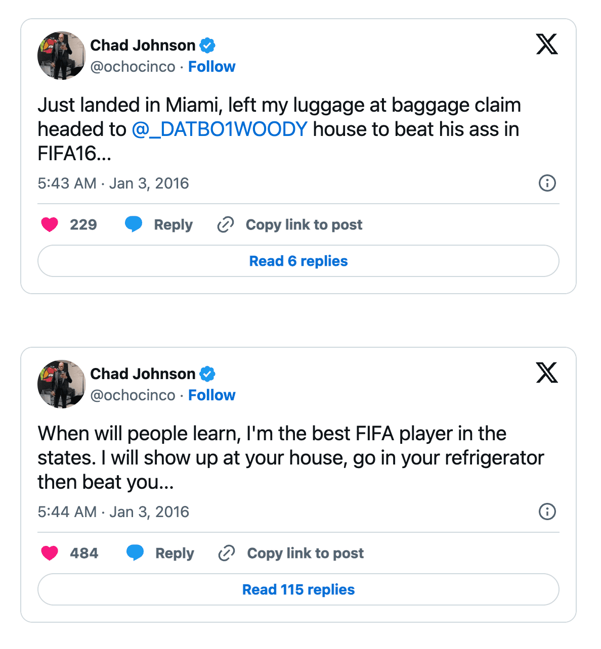 Anm. d. Red.: Übersetzung Post Nr. 1: Bin gerade in Miami gelandet, habe mein Gepäck bei der Gepäckausgabe abgegeben und bin zu @_DATBO1WOODYs Haus gefahren, um seinen Hintern in FIFA16 zu verprügeln … Übersetzung Post Nr. 2: Wann werden die Leute lernen, dass ich der beste FIFA-Spieler in den Staaten bin. Ich werde bei dir zu Hause auftauchen, in deinen Kühlschrank gehen und dich dann schlagen …