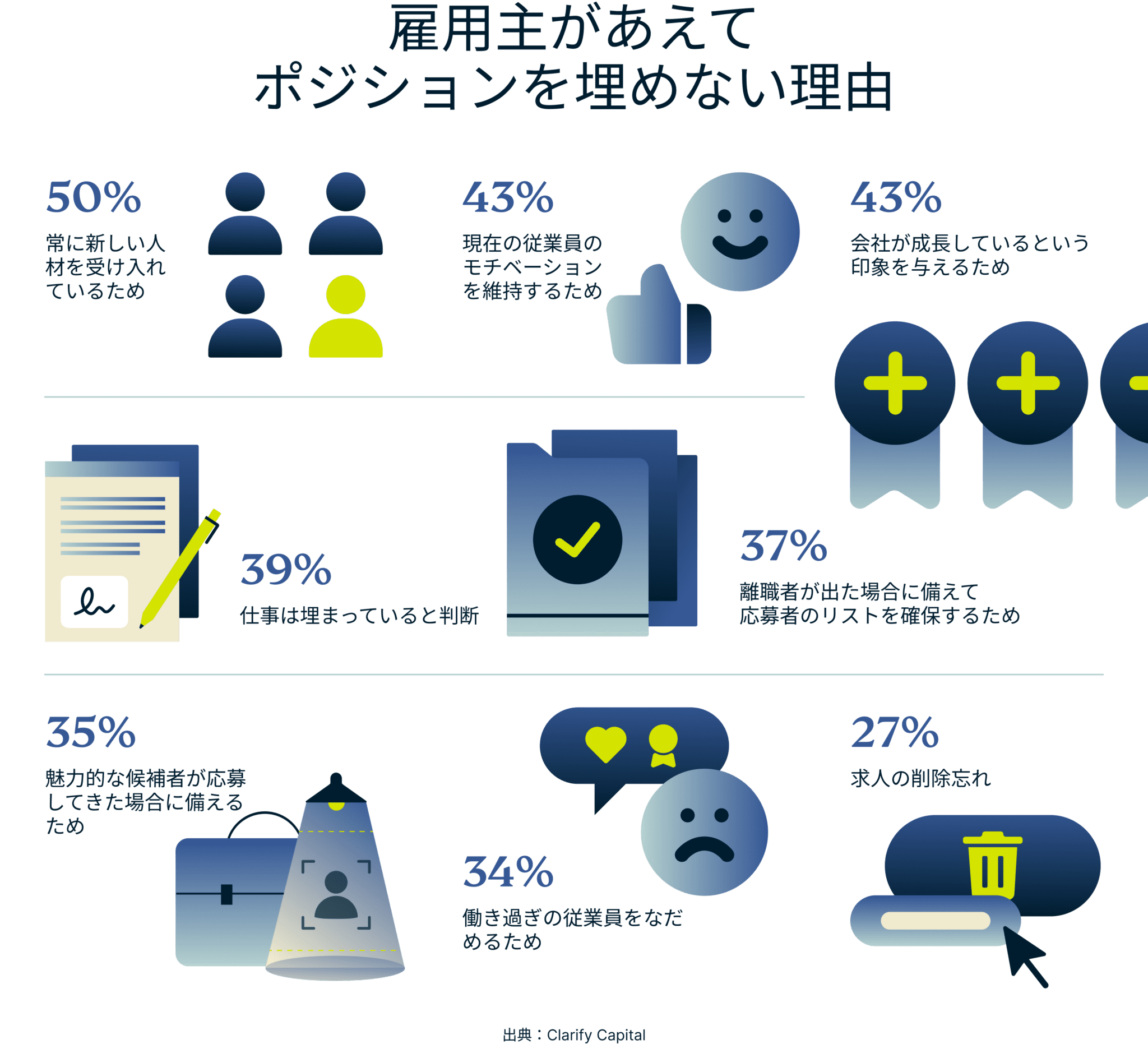 • Clarify Capitalの調査によると、多くの雇用主は優れた候補者が応募する可能性があるため、空求人をリストに保持しているが、43%の空求人掲載者は企業が成長している印象を与えるために行っている。