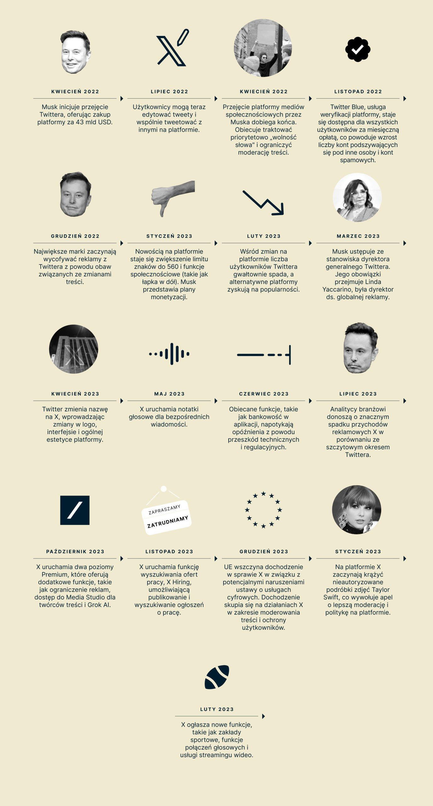 Podróż X pod wodzą Muska nie była jednak nudna. Platforma przeszła wiele zmian, zbierając zarówno pochwały, jak i krytykę. Zwolnienia w firmie, opłaty abonamentowe, zwiększone limity znaków i całkowity rebranding stworzyły wizerunek firmy nieustannie dążącej do transformacji. Następnie wydarzyło się coś, co wzbudziło tyle samo zaskoczenia, co zakup platformy – Musk ustąpił ze stanowiska dyrektora generalnego i przeszedł na stanowisko prezesa wykonawczego i CTO w maju 2023 r., chcąc skupić swoją uwagę na strategicznym kierunku X i innowacjach technologicznych.