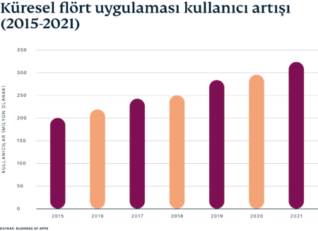 Bu rakam, küresel istatistiklere 2021 yılında flört uygulamalarına kayıtlı 300 milyondan fazla kişi olarak yansıyor.